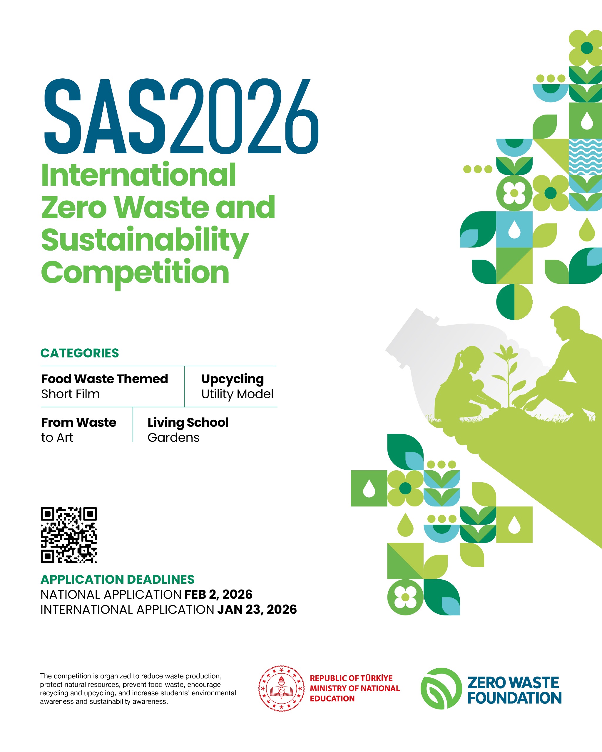 With the aim of developing environmental awareness and a culture of sustainable living among students, the promotional poster and terms and conditions document for the 2026 International Zero Waste and Sustainability Competition (SAS2026), organized under the patronage of Mrs. Emine Erdoğan, in cooperation with the Ministry of National Education and the Zero Waste Foundation, are hereby presented for the attention of all interested parties.